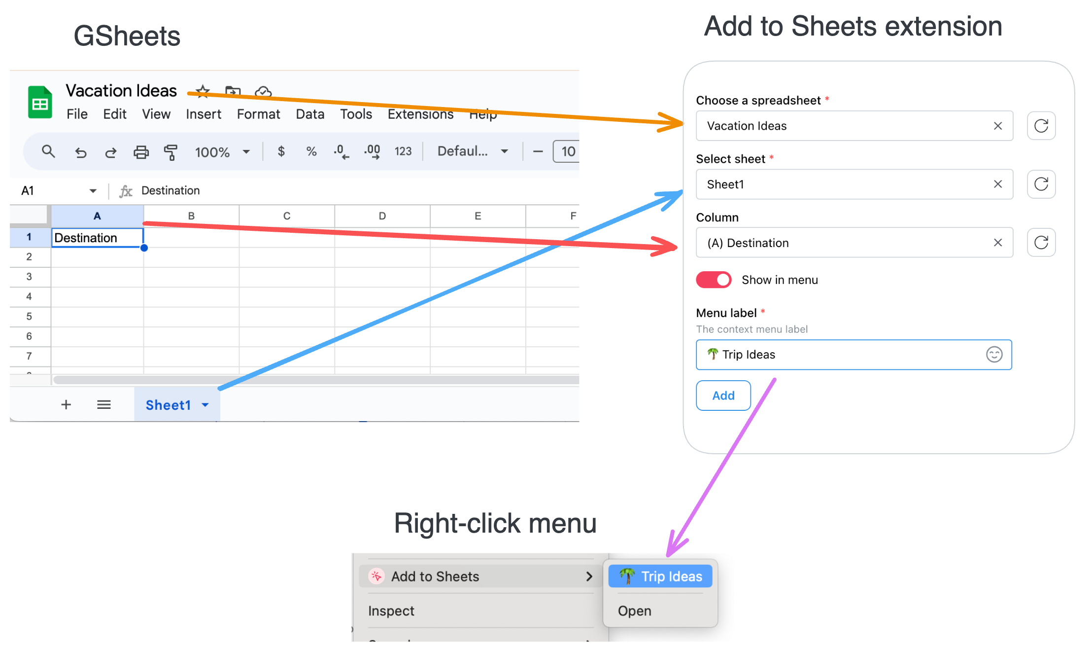 In the extension, you configure where (spreadsheet > sheet > column) you want to save content and give it a name. Then, when you’re browsing the web, you can right-click and select the menu item (with the name you gave it) to save the content to your Google Sheets. When you click the menu item, the data you selected is saved to the Google Sheets Drive file, and location in that file, that you configured.