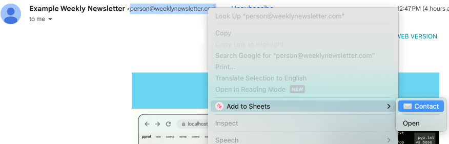 Now, when you’re browsing Gmail, right-click on an email and select the ✉️ Contact menu item to save the email to your spreadsheet.